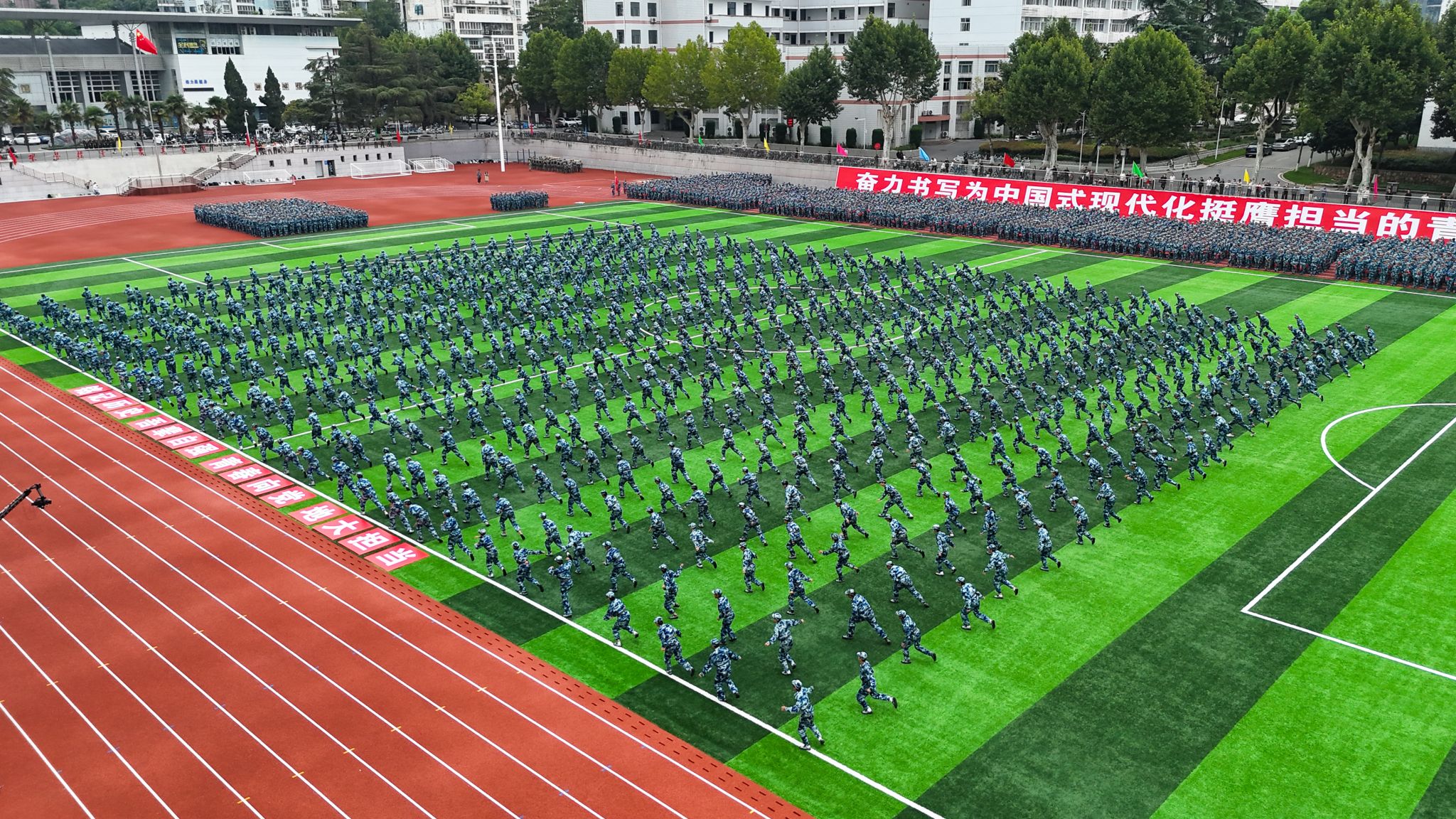 各学院新生组成的33个方阵斗志昂扬,以饱满的精神、严整的队形、嘹亮的口号,依次走过主席台前接受检阅,他们身姿挺拔如松、步伐整齐划一,展现了地大学子积极向上的青春风采。