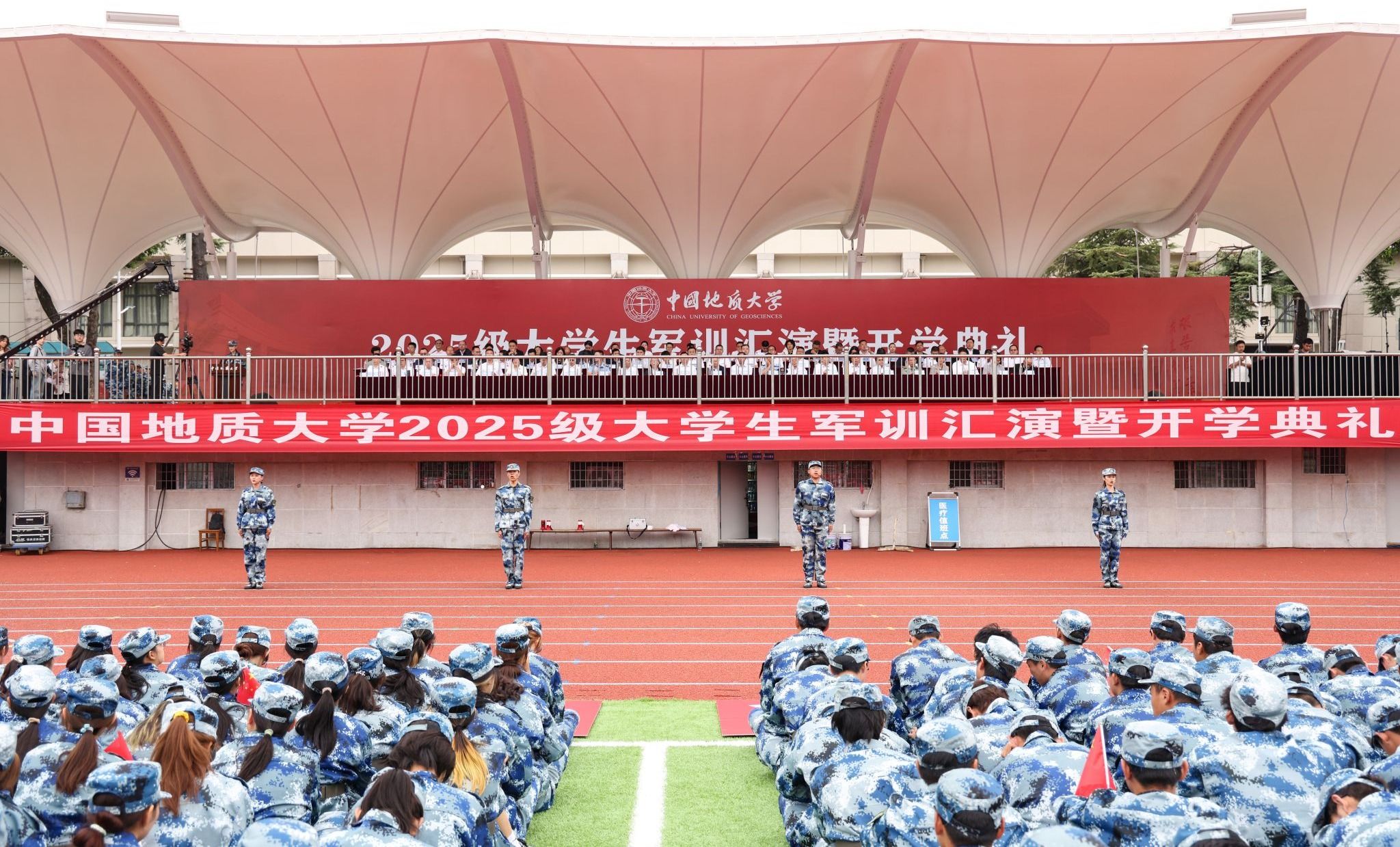 校党委书记刘杰,校长李建威,中国科学院院士殷鸿福、谢树成,教育部直属高校党建工作联络员谢守成,军训承训单位空军预警学院有关领导,校党委副书记唐忠阳、王甫,副校长章军锋、胡守庚、夏帆、王文起,党委常委、党委组织部部长陈文武,教师代表、地球科学学院教授马强,校友代表、中铁第一勘察设计院集团有限公司高级工程师王杜江,各教学科研单位、管理服务机构主要负责人,教师代表,辅导员老师,高年级学生代表,全体承训教官以及2025级全体本科新生参加典礼。