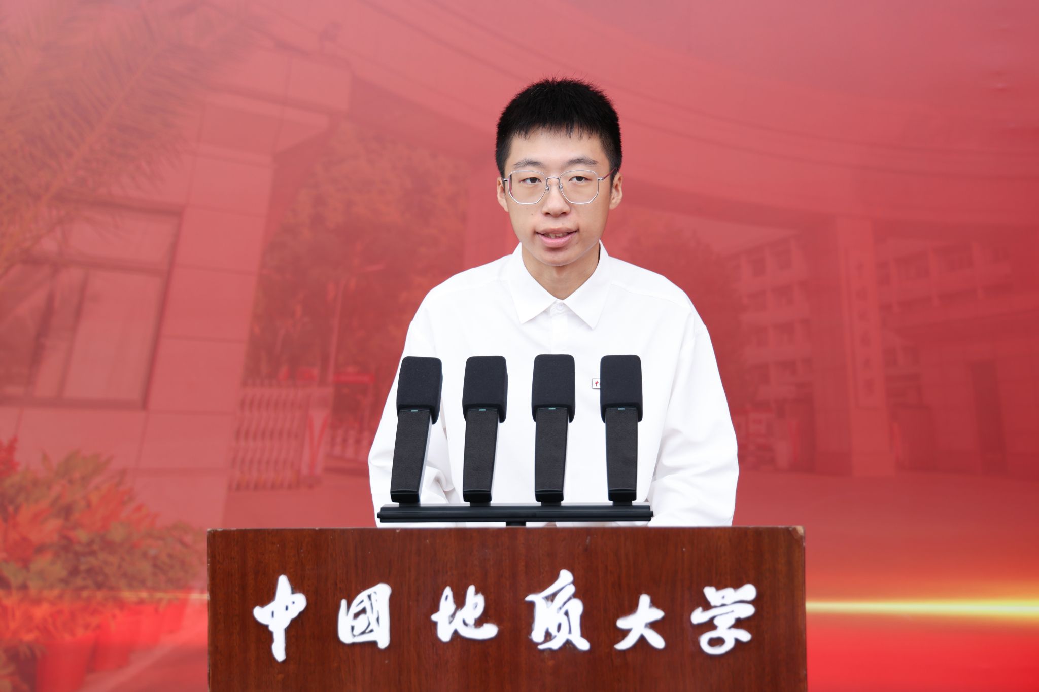 李佳润与4位新生代表共同发出倡议:我愿与山海为伴,不断攀登和挑战,努力探求科学与真理。我愿以校训为光,不畏艰苦和挫折,奋力抵达光辉的顶点。我将以此身长报国,在祖国和人民最需要的地方,传承使命、绽放青春。以山河为卷,以青春为墨,以行动为笔,让我们共同为地大、为祖国,续写新的、更伟大的篇章!