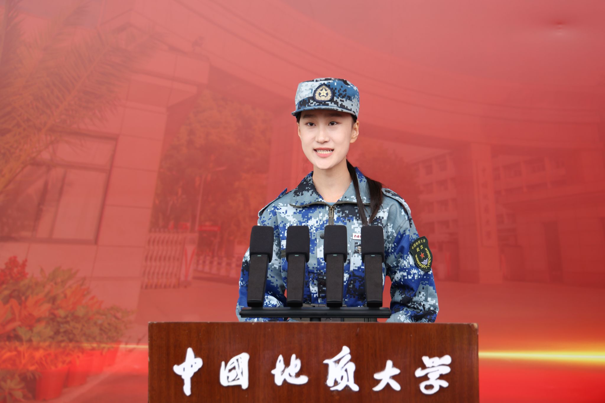 新生代表、资源学院2025级本科生李佳润发言,她说,地质报国不是一句空洞的口号,需要我们用脚步去丈量,用实践去书写。她期待不久的将来,真正成长为“艰苦朴素、求真务实”的地大人,去“上天、入地、下海、登极”,扛起新时代地质人建设“美丽中国 宜居地球”的时代使命。